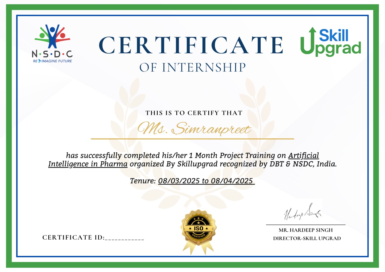 Here you have the sample certificate, you can also customize the dates according to your internship period